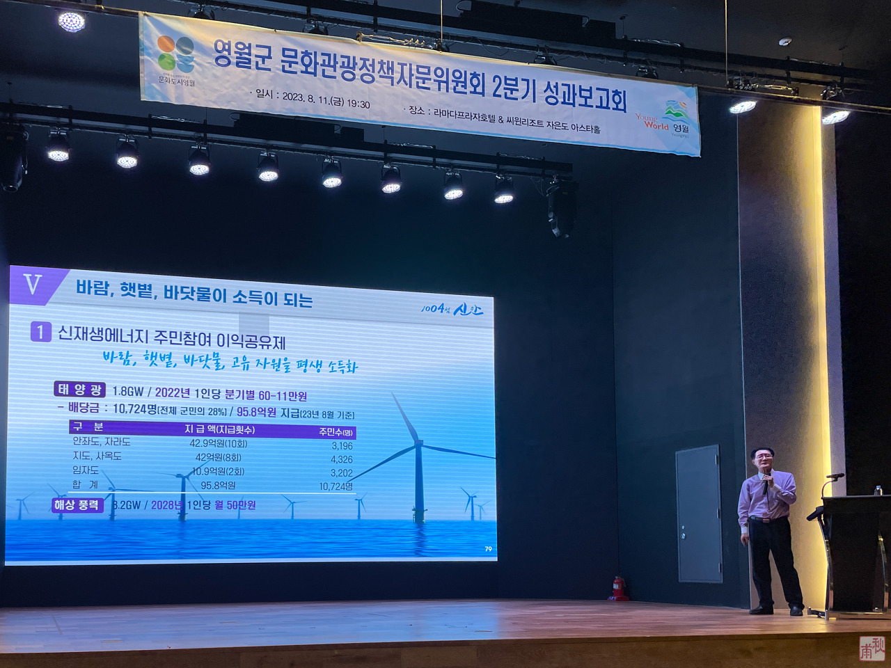 박우량 군수님의 강연은 그동안 단체장들의 강연과 확연히 다른 면이 있었다. 나 같은 전문 강사는 직접 프레젠테이션용 슬라이드를 만들고 수정하고 편집하면서 전체 시나리오를 구성하는데 익숙하지만 단체장이고 연령을 생각하면 직접 만들지 않았을 것 같은 자료인데 너무나 자연스럽게 연결되면서 임팩트가 필요한 곳마다 적절하게 강조하는 여유와 카리스마가 있었다. 조금 허스키한 목소리지만 쩌렁쩌렁한 힘이 느껴졌다. 전문 강연자다운 면모였다. 해당 발표 자료를 다양한 곳에서 수없이 많이 프레젠테이션을 했기 때문에 가능한 것으로 보인다. 이 보다 더 중요한 것은 추정컨대 신안군의 단체장으로 1004섬의 설계자로 모든 사업의 기획에 직접 참여하여 구체적인 내용을 속속들이 다 알고 있기 때문일 것이다. 인구 소멸로 위기에 처한 고향을 살리기 위한 처절한 몸부림이자 진심 어린 열정으로 느껴졌다.