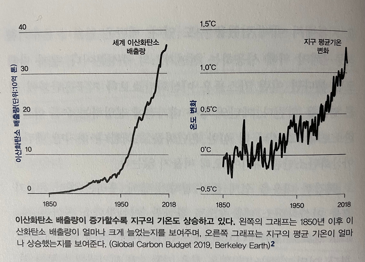 p.8. 기후변화와 관련하여 당신이 기억해야 할 숫자는 두 개 있다. 하나는 510억이고 다른 하나는 제로(0)다. 우리는 매년 510억 톤의 온실가스를 대기권에 배출한다. ~ 크게 보면 온실가스 배출량은 꾸준히 증가한다. 이것이 바로 오늘날 우리가 처해 있는 현실이다. 제로는 우리가 달성해야 할 목표다.