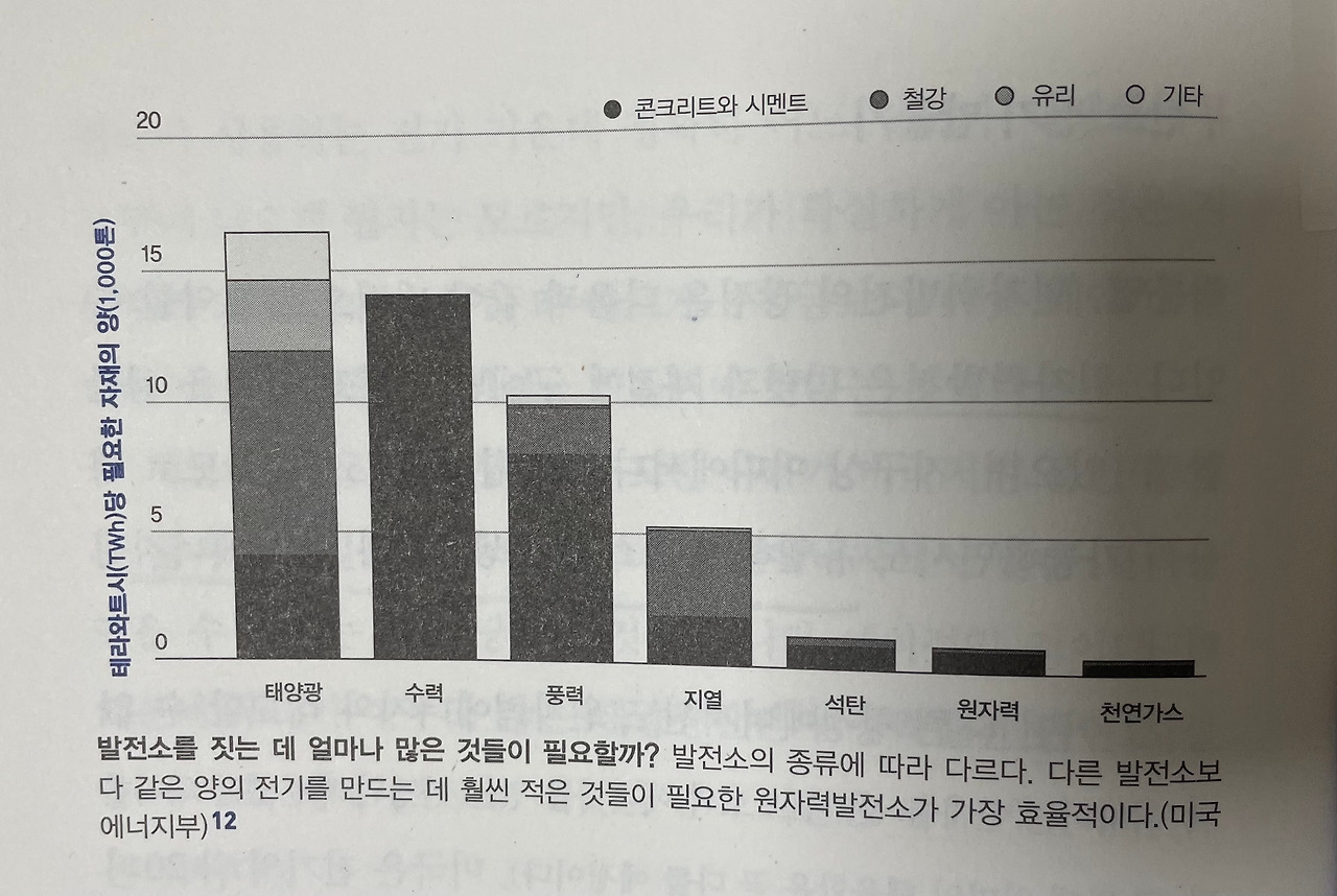 p.124. 원자력 발전소 막대가 얼마나 작은지 보이는가? 즉, 원자력발전소는 발전소를 짓는 데 필요한 건축자재 1톤당 훨씬 더 많은 에너지를 생산할 수 있다.