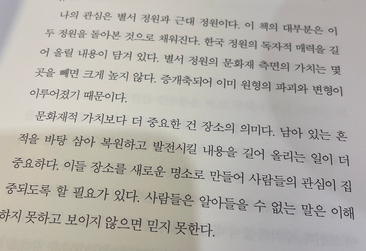 이 책에서 다룬 정원 중에 담양 소쇄원은 2009년 사진공부를 할 때 말씀하셨던 곳이기도 했고 당시 광주 출장길에 한번 방문한 적이 있다. 그때는 보이지 않았던 것을 이 책을 따라가며 필름을 거꾸로 돌리듯 다시 사진을 보며 느꼈다. 보는 것과 느끼는 것의 차이를 알겠다.