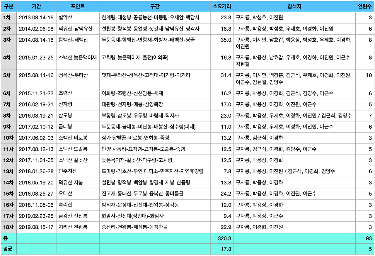 그동안 백두대간 계성 BSK 원정대(백계)는 2013년 8월부터 2019년 8월까지 6년 동안 총 18회 차에 걸쳐서 320.8km의 대간길을 연인원 93명(대원 13명)이 함께 트레킹 했다. 그 시간과 장소마다 소중한 추억이 있었고, 백두대간이 갖고 있는 역사와 문화와 생태에 대해 함께 고민해 보는 계기가 되었다.