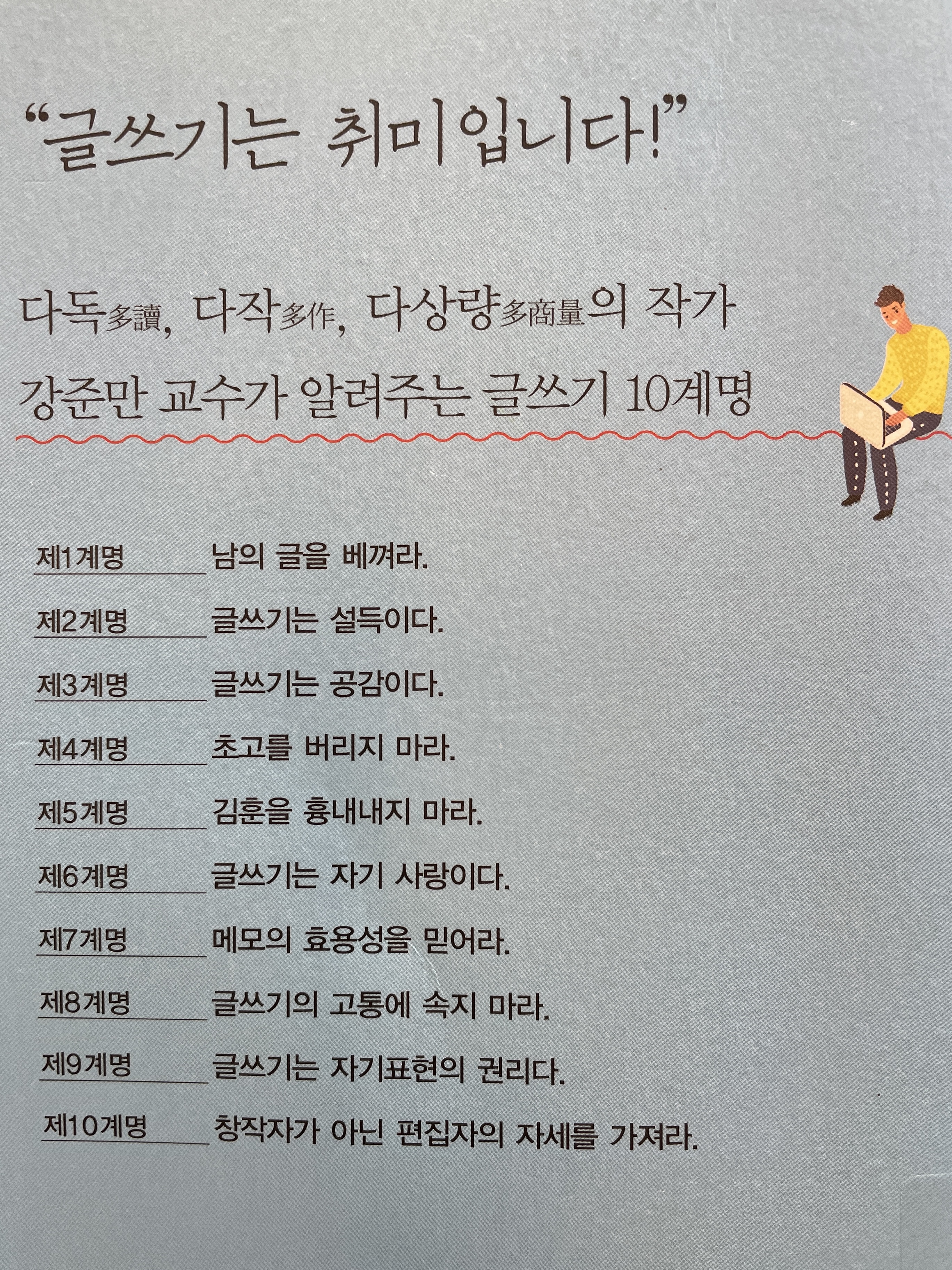 p.27. “작가들이 말하는 ‘글쓰기 고통’에 속지 마라. 스스로 자기 자신을 속이지도 마라. 눈높이를 낮추면 ‘글쓰기의 고통’은 ‘글쓰기의 즐거움’이 된다.”
