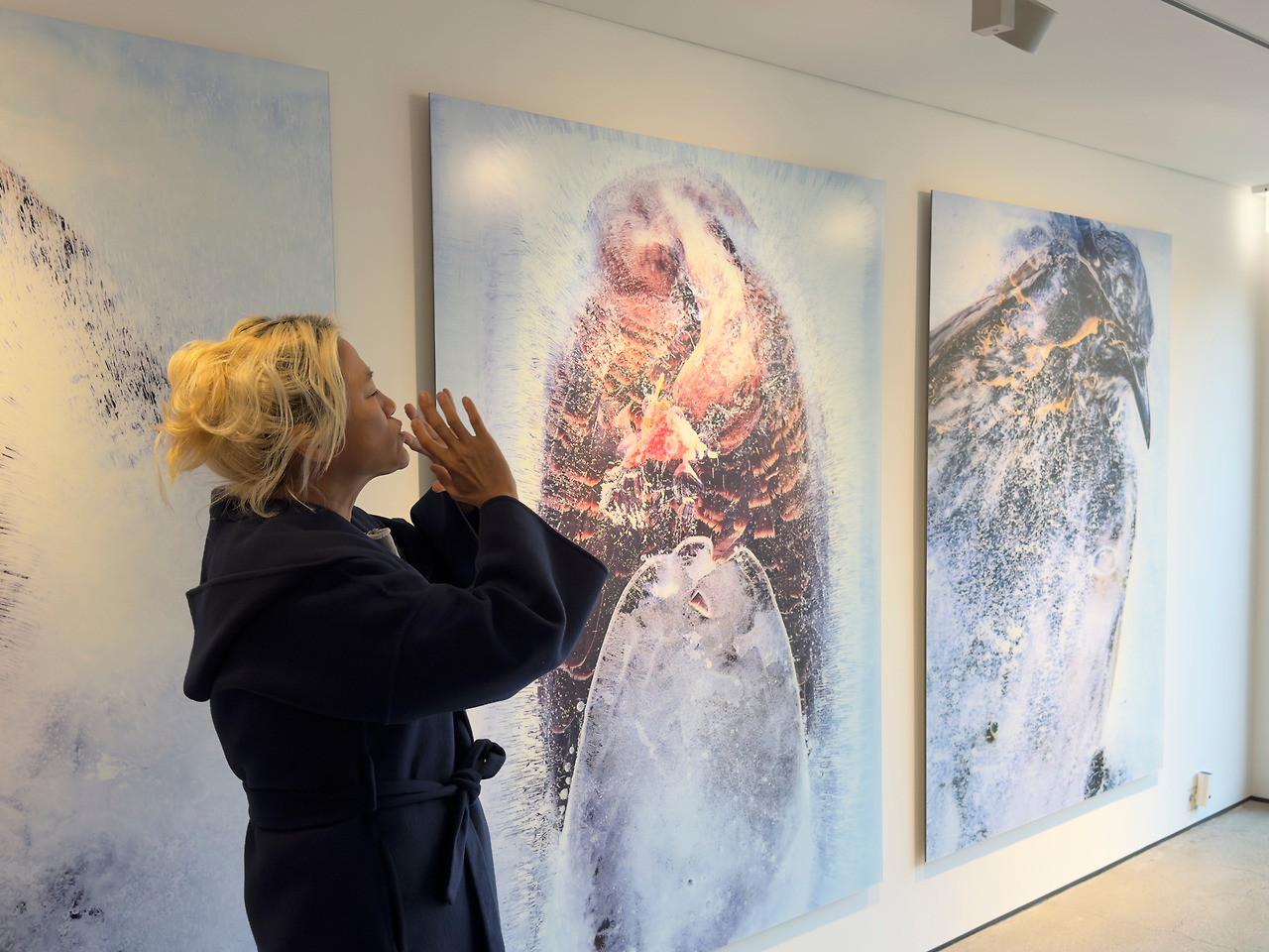 조선희 개인전 《FROZEN GAZE》 관람에서 작가의 도슨트와 토크 시간이 있었다. 소탈하고 열정적인 작가의 모습을 보면서 에너지를 받았다. 어느 날 우연히 문 앞에 죽은 새의 사체를 보면서 아버지의 죽음을 떠올리게 되었다고 한다. 로드킬 당한 새를 얼리고 녹이는 과정을 통해 죽음에 대해 성찰한 내면의 섬세한 감정을 느낄 수 있었다. 얼음 결정체가 수돗물, 정수물, 생수, 온수 등 물의 성질에 따라 다르다는 것을 관찰했다고 한다. 수많은 시도와 실패를 통해 메이킹을 했다고 한다. 이제 사진은 테이킹이 아니라 메이킹이다는 것을 보여준 전시이기도 하다.