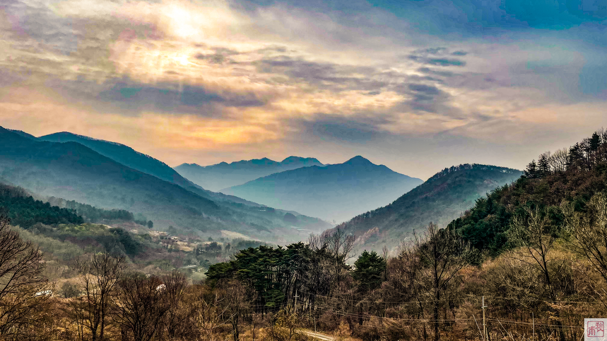 도장산 넘어구름 사이로밝게 빛나는 햇살우복동 원적골 청화산깊은 골짜기에 미소 머금은 청화산인